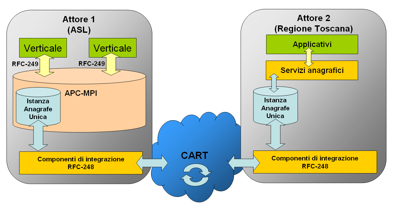 L’Anagrafe Unica Regionale è dispiegata nel territorio in più istanze. Ogni attore del sistema (Aziende Sanitarie, Regione Toscana) ha accesso ad un’istanza di Anagrafe Unica nella quale esegue censimenti e aggiornamenti di posizioni anagrafiche secondo un insieme di regole condivise. Per l’attore Azienda tali operazioni avvengono a fronte di un contatto del soggetto con uno sportello (ad es. accettazione ambulatoriale).